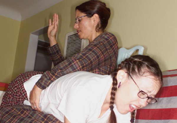 Two schoolgirls, played by Sarah and a young Sinn Sage (one of her first spanking videos ever), are spanked at school, by the very strict Chelsea Pfeiffer, who takes Sarah, then her sister Sinn over her knee of some hard hand spankings, then spankings with implements and then she sends them home with a note, where there mother spanks them, too.